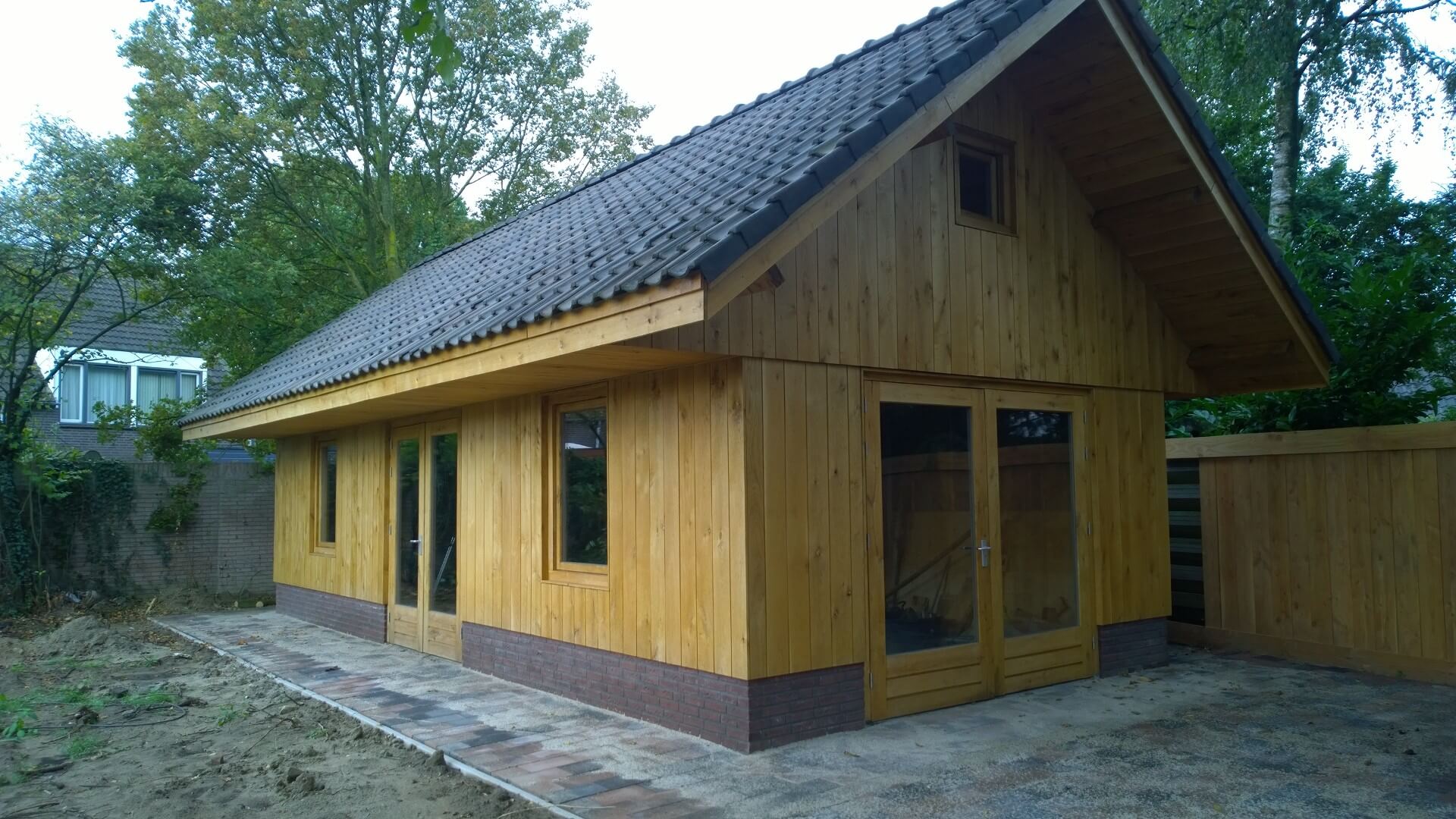 Dit volledig geisoleerd tuinhuis is gebouwd op een sterke fundering. Een gevlinderde betonvloer met daarop een paar lagen metselwerk. Hierna is het geraamte met eiken betimmerd om het een rustieke uitstraling te geven. Om het eiken enigszins te beschermen tegen weersinvloeden is er gekozen voor een grote overstek met sfeerverlichting.